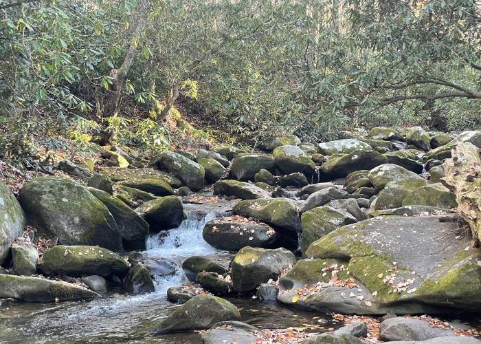 After walking a short distance Rock Creek will appear on your right. Soon after you'll pass the side trail that leads to the Cosby Campground, almost four-tenths of a mile from the trailhead. Shortly thereafter the trail crosses over Rock Creek.