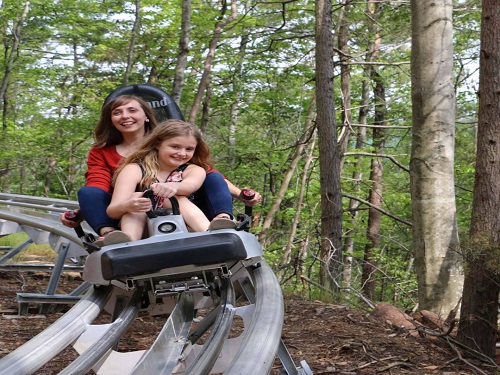 The Rowdy Bear Mountain Coaster is a gravity propelled Alpine Coaster that reaches speeds up to 35 mph while it winds through the Woods of Rowdy Bear Mountain. You control your speed! Riders may ride Single or Double *See Height and Weight Restrictions. This ride is easy to operate, you simply push your handles forward to go and pull back to slow down. This ride operates in the Rain, Sleet, Snow, and Sunshine. Rowdy Bear Mountain Coaster has the latest intelligent Distance Control System on our Carts. We are very Proud of this safety feature as it Does NOT allow carts to come in contact with one another. This Feature offers a Fun, Safe, and Enjoyable family experience.