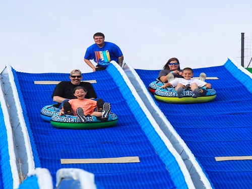 Rowdy Bear Ridge is home to Tennessee’s First, Fastest, and Longest Year-Round Outdoor Tubing Hill. This Tubing Hill is over 500 feet in length with a 70-foot drop and reaches speeds over 35mph. Guests can tube single or connect up to three tubes for an amazing adventurous experience.Once you’re at the top of Rowdy Bear Ridge- take a moment to take in the beautiful views of Pigeon Forge and the Great Smoky Mountains. Guests can choose any color tube they like and make their way to the magic carpet conveyor. This conveyor takes Rowdy guests to the top of the Ridge- so no hiking is involved. This tubing hill is not a water ride, it is a year-round product that is brilliant blue in color. No worries, you’re always dressed appropriately to ride.